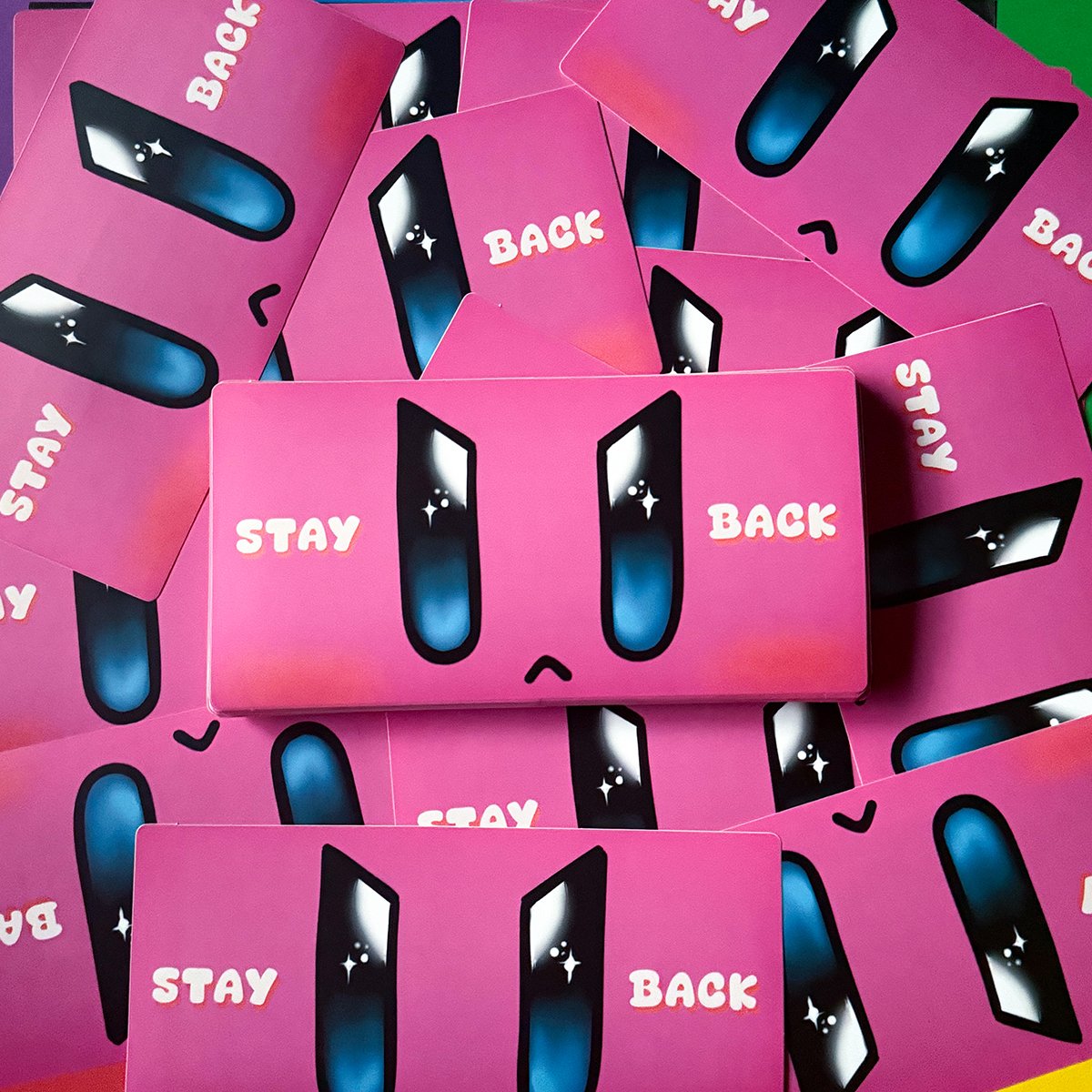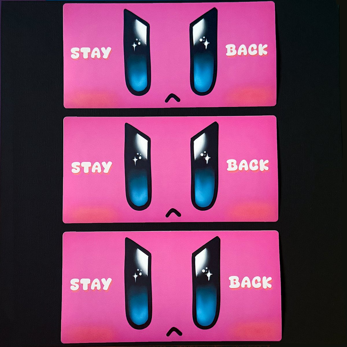 Anxious drivers unite! This bumper sticker features an adorable but very ANGY Kirby letting others around you know to STAY BACK! Do not let them intimidate you, now that Kirby's got your back -- literally.